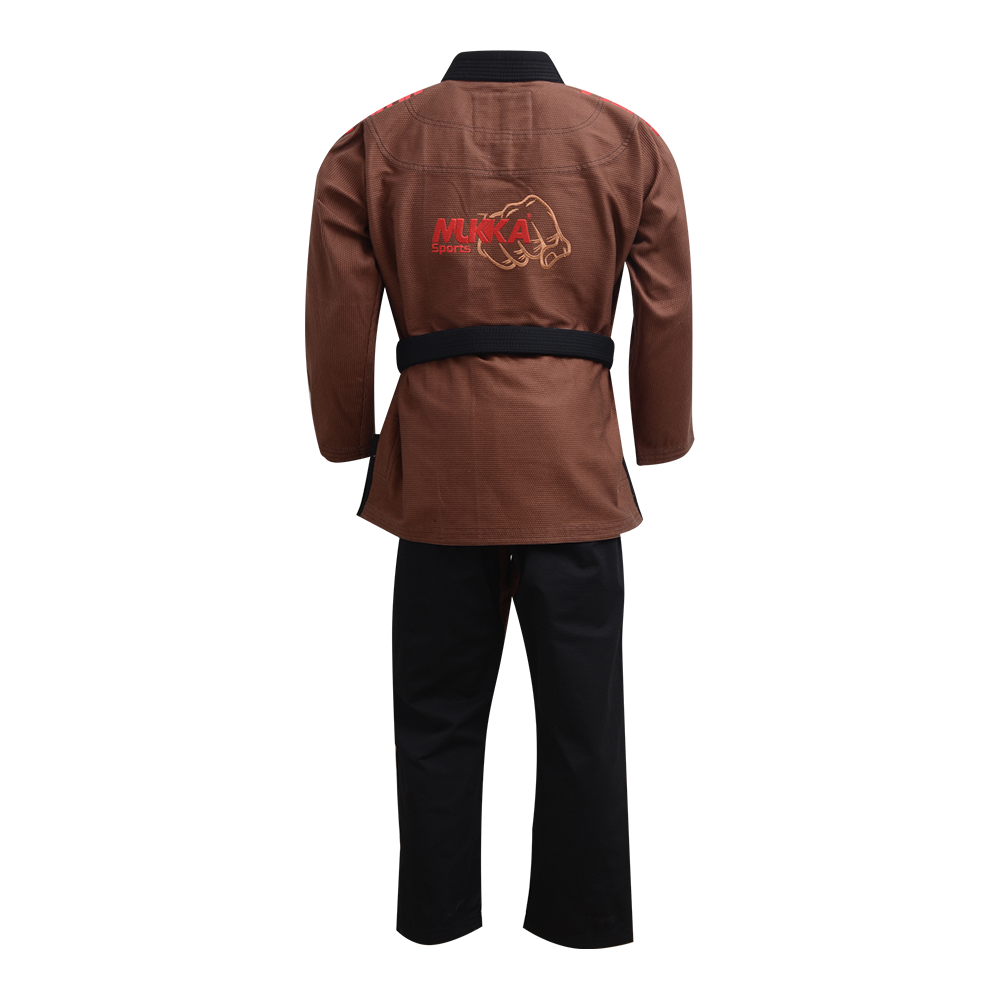 The Mukka Sports Brazilian Jiu-Jitsu Suit is designed to deliver durability, comfort, and performance for intense BJJ training and grappling sessions. Featuring a stylish brown BJJ jacket paired with black ripstop pants, this uniform offers a modern look while maintaining the strength and functionality required for Brazilian Jiu-Jitsu practice.