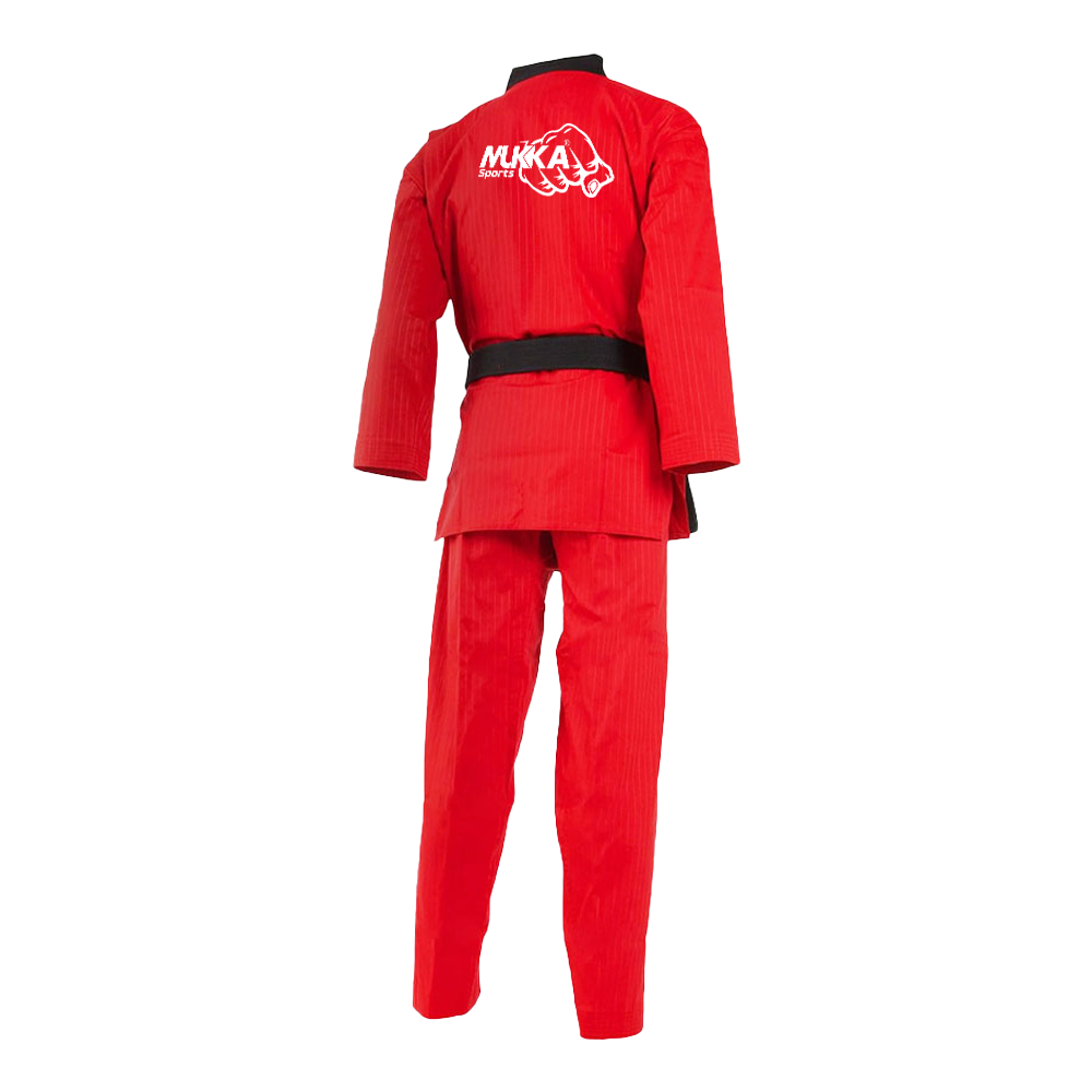• Professional red karate uniform with Mukka Sports branding